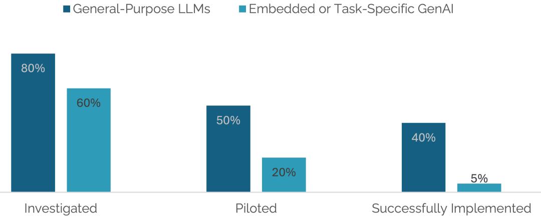 从试点到实际应用,对于具体任务的 AI(浅蓝色)引入下降明显,成功实施仅有 5%