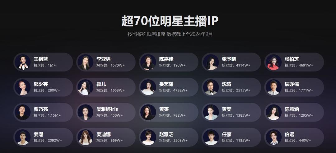 作为一家MCN机构,遥望科技(002291.SZ)可谓星光熠熠。据官网披露,截至2024年9月,已签约贾乃亮、王祖蓝、张柏芝、陆毅等超过70位明星直播,这些明星的粉丝量均在数百万、上千万乃至过亿。