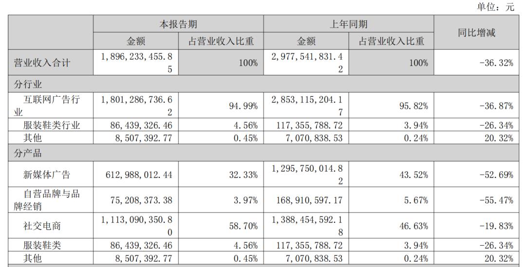 今年的半年报中,遥望科技的业务发展状况体现得更加清晰。当期,公司各项业务的主要经营指标几乎全线下滑,新媒体广告、自营品牌与品牌经销、社交电商等收入分别下滑52.69%、55.47%、19.83%,毛利率也均有不同程度下降。