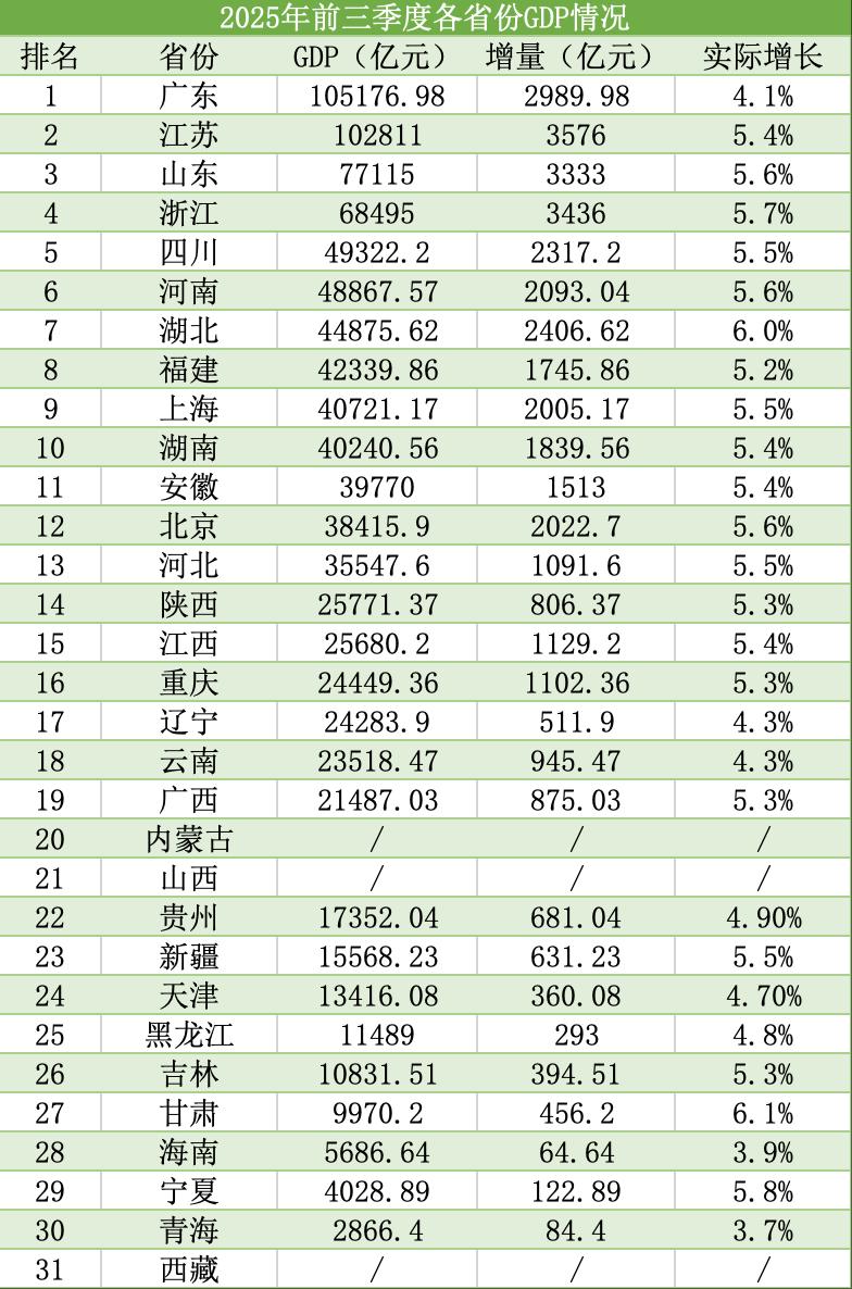 在已公布GDP数据的28个省份中,广东以105176.98亿元位列总值第一,持续领跑;江苏紧随其后,前三季度GDP越过10万亿元大关,以3576亿元的增量暂列第一;甘肃则凭借6.1%的增速暂时领跑全国。