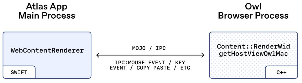 从高层来看,Atlas 浏览器是 OWL 客户端,而 Chromium 浏览器进程是 OWL 主机(Host)。两者通过 Mojo(Chromium 的进程间通信系统)进行通信。OpenAI 编写了 Swift(甚至 TypeScript)的 Mojo 绑定,使 Swift 应用能直接调用主机端接口。