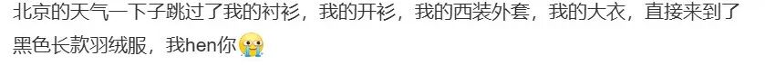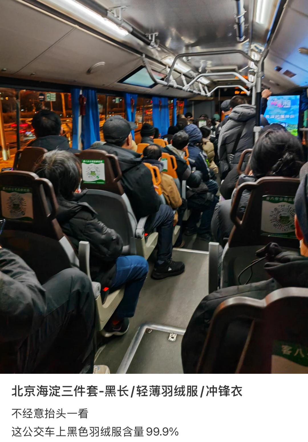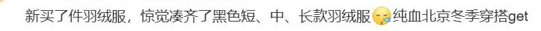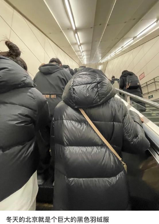 “冬天到了,全体北京人都从衣柜里精挑细选出了一件黑色羽绒服。”
