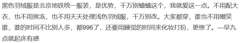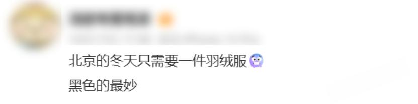 “当你穿着几万块钱的MaxMara羊绒大衣,被北京妖风穿堂而过时,会明白黑羽绒服朴素的智慧。”