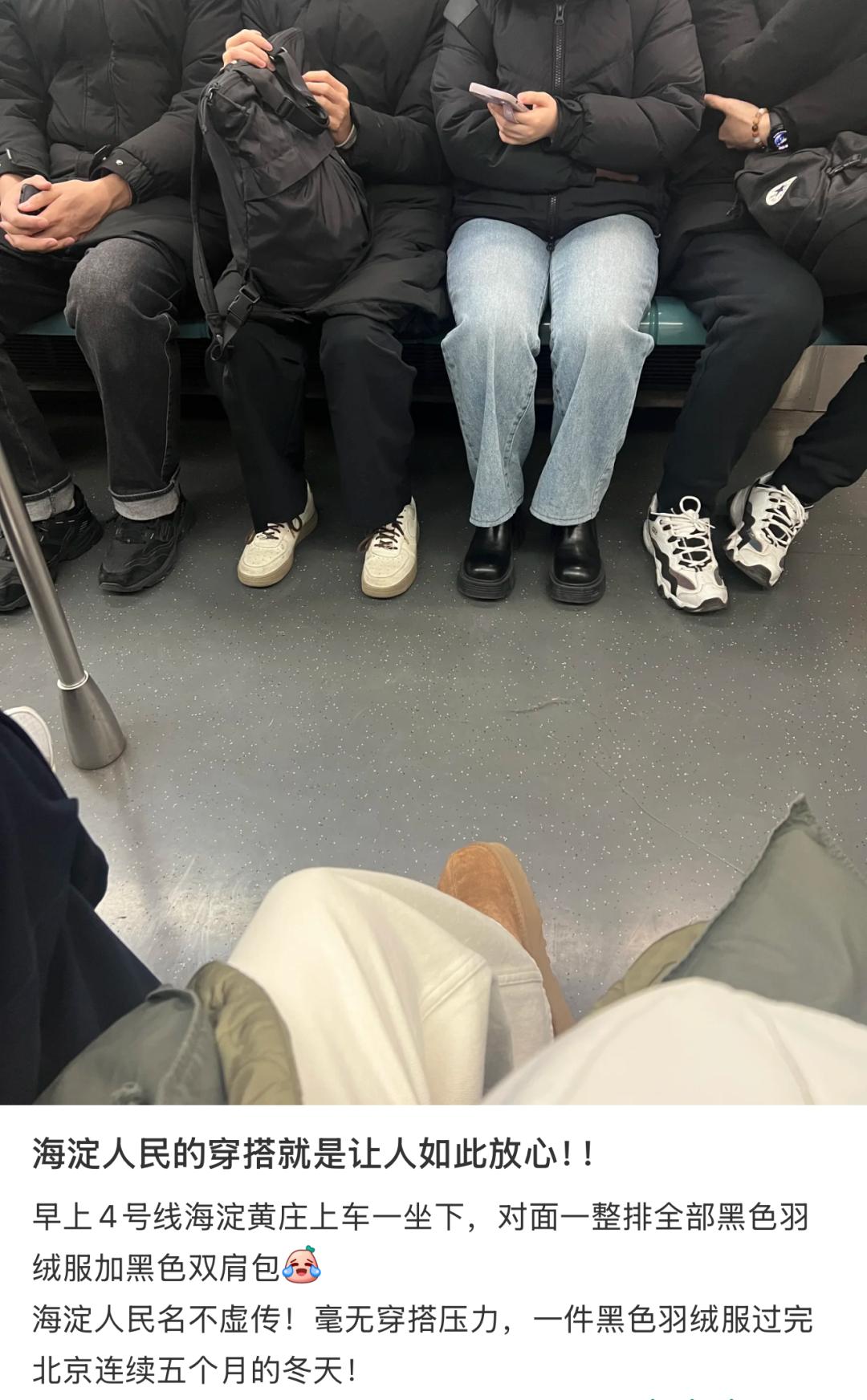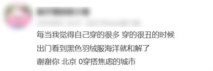 当然,也有人用流行的互联网热梗解读它:北京街头穿黑色羽绒服的人社会化程度好高啊——