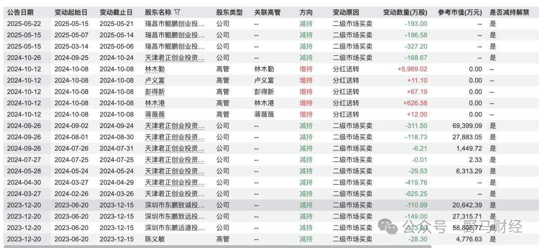2025年2月,鲲鹏投资因自身资金需求计划减持不超过716.9万股,按2025年10月10日的股价计算,预计套现约22亿元。与此同时,原第一大股东君正投资自2022年起多次减持,累计套现约33.71亿元,其公开说明原因为“自身资金需求”;蔡运生、陈海明、陈义敏等其他股东也先后减持,分别套现约1707万元、2161万元和457万元。
