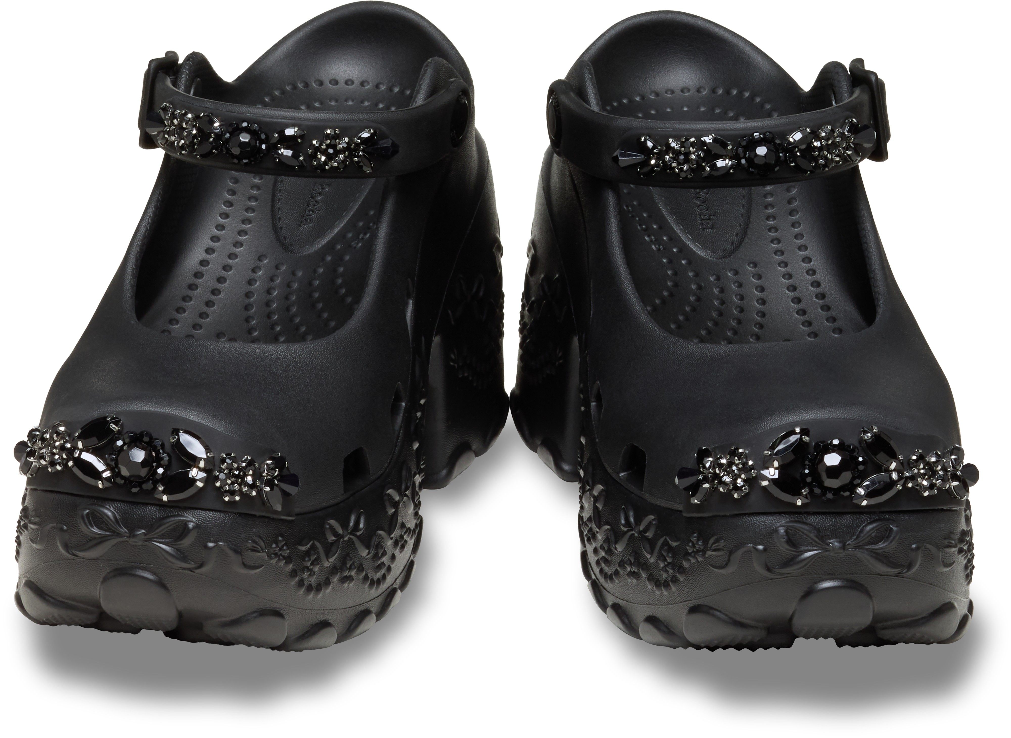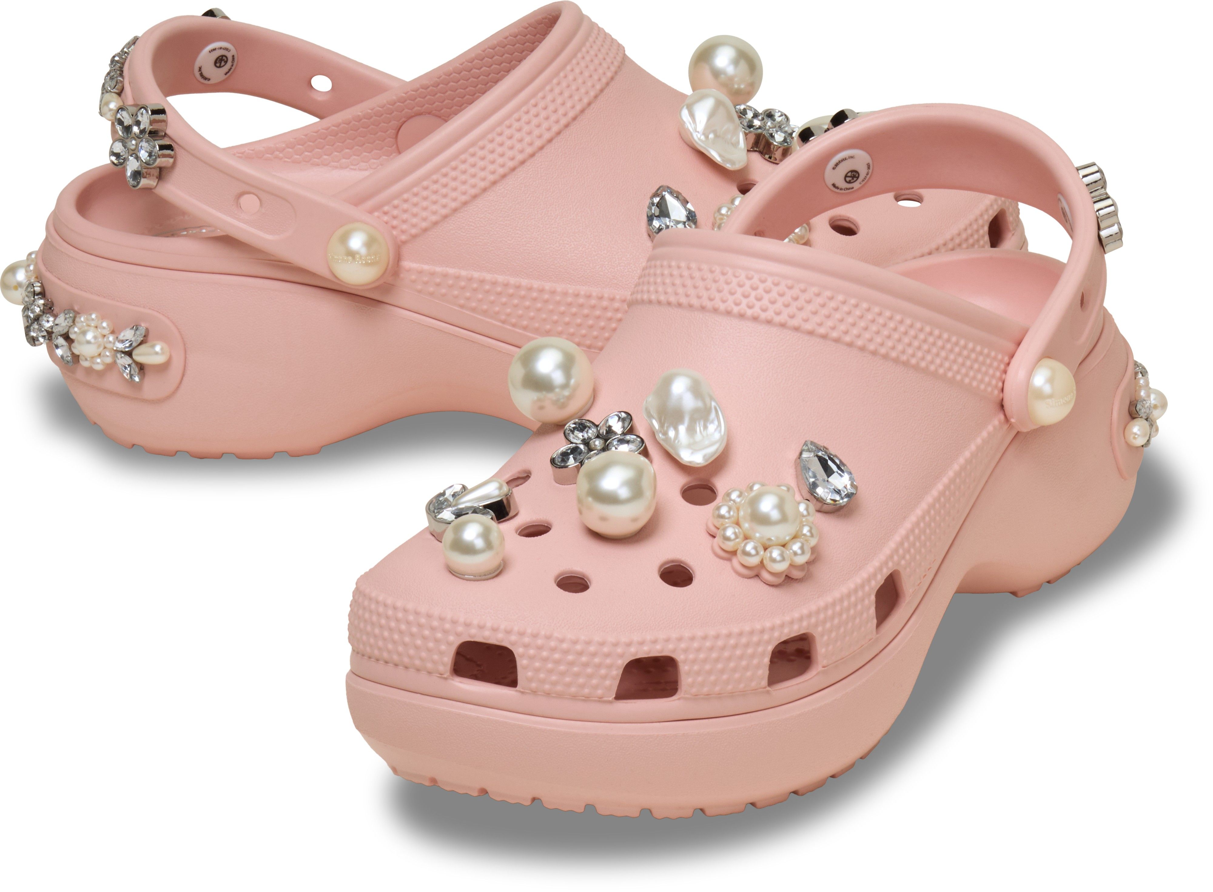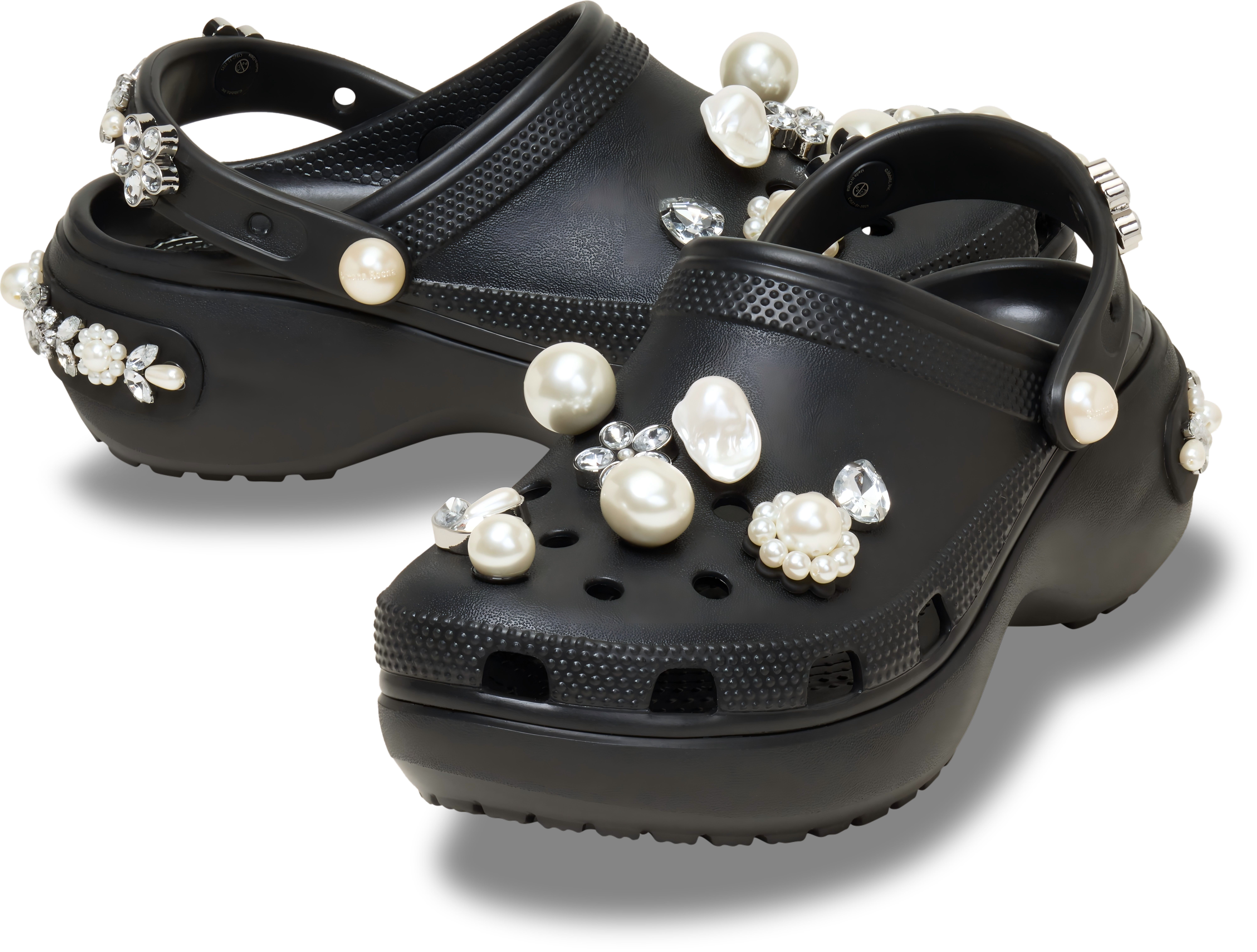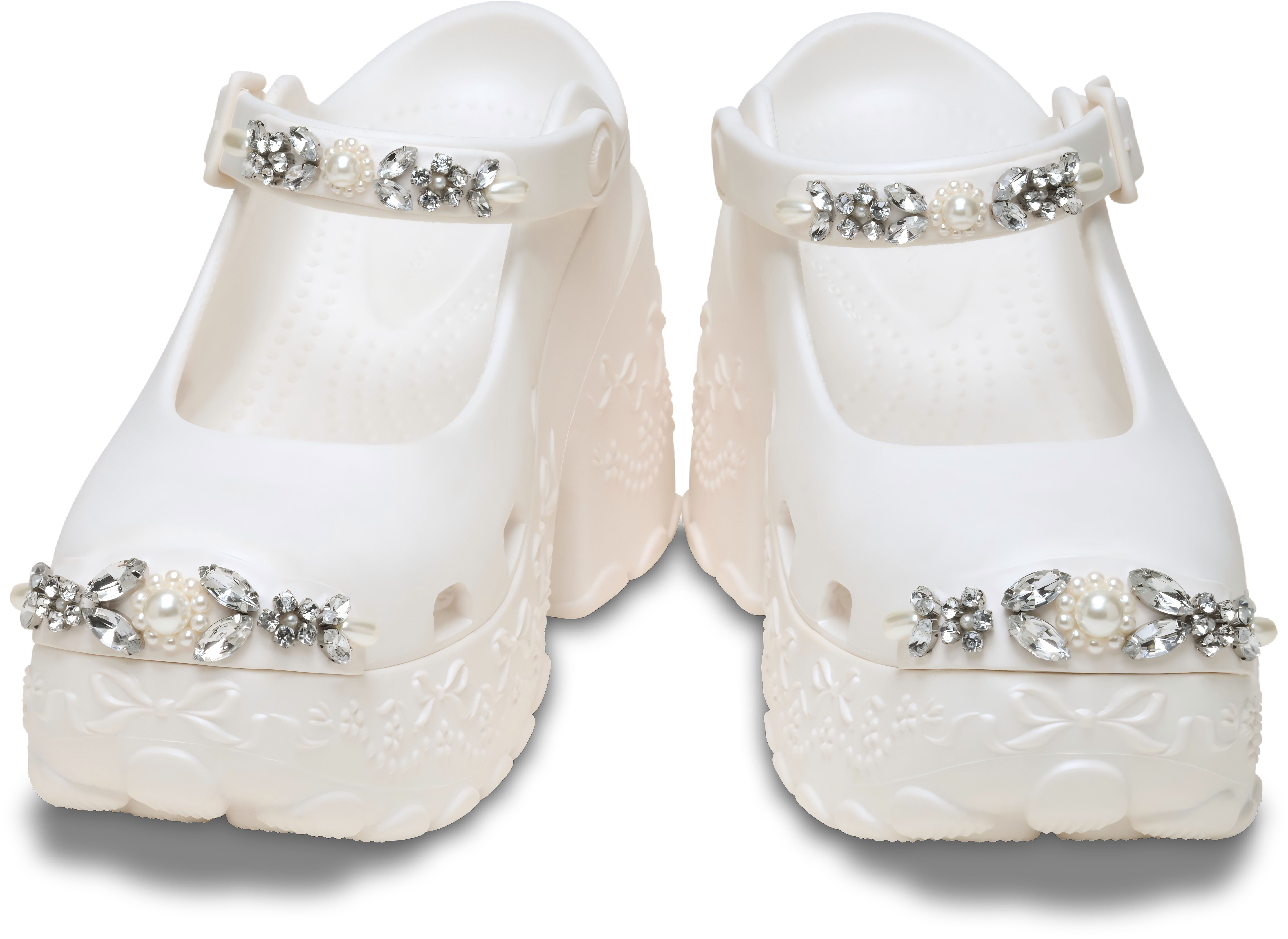 此次联名合作推出了全新Simone Rocha x Crocs Ballerina Platform洞洞鞋,其廓形灵感源于Crocs卡骆驰经典的人鱼洞洞鞋,在缀以珍珠与水钻装饰后,整体造型兼具建筑美感、实用性与玩趣态度。源自芭蕾足尖鞋的一体成型压模细节,配以雕塑感外底及灵动优雅的蝴蝶结元素,完美融合了Crocs的实用主义与Simone Rocha高级定制美学的设计语言。