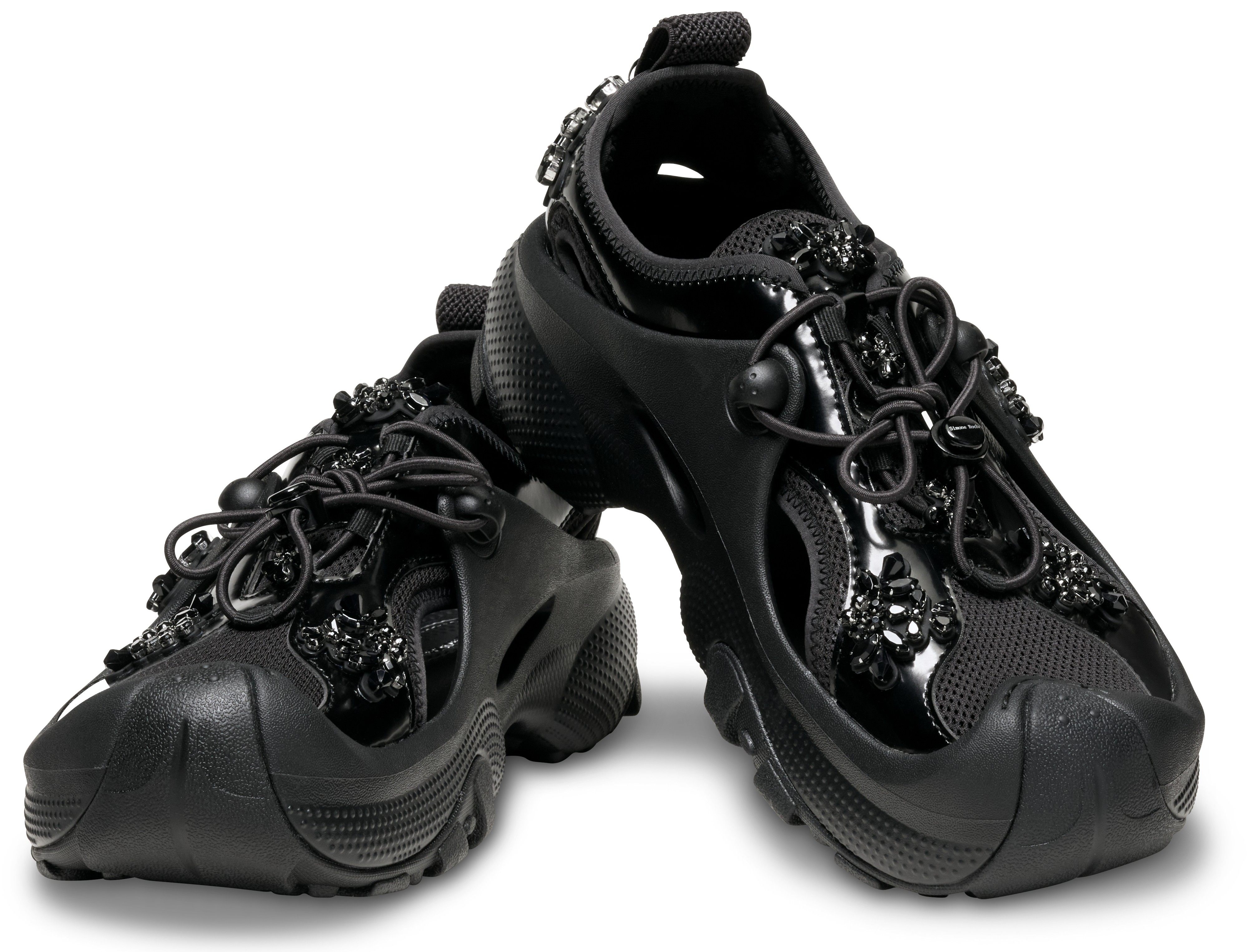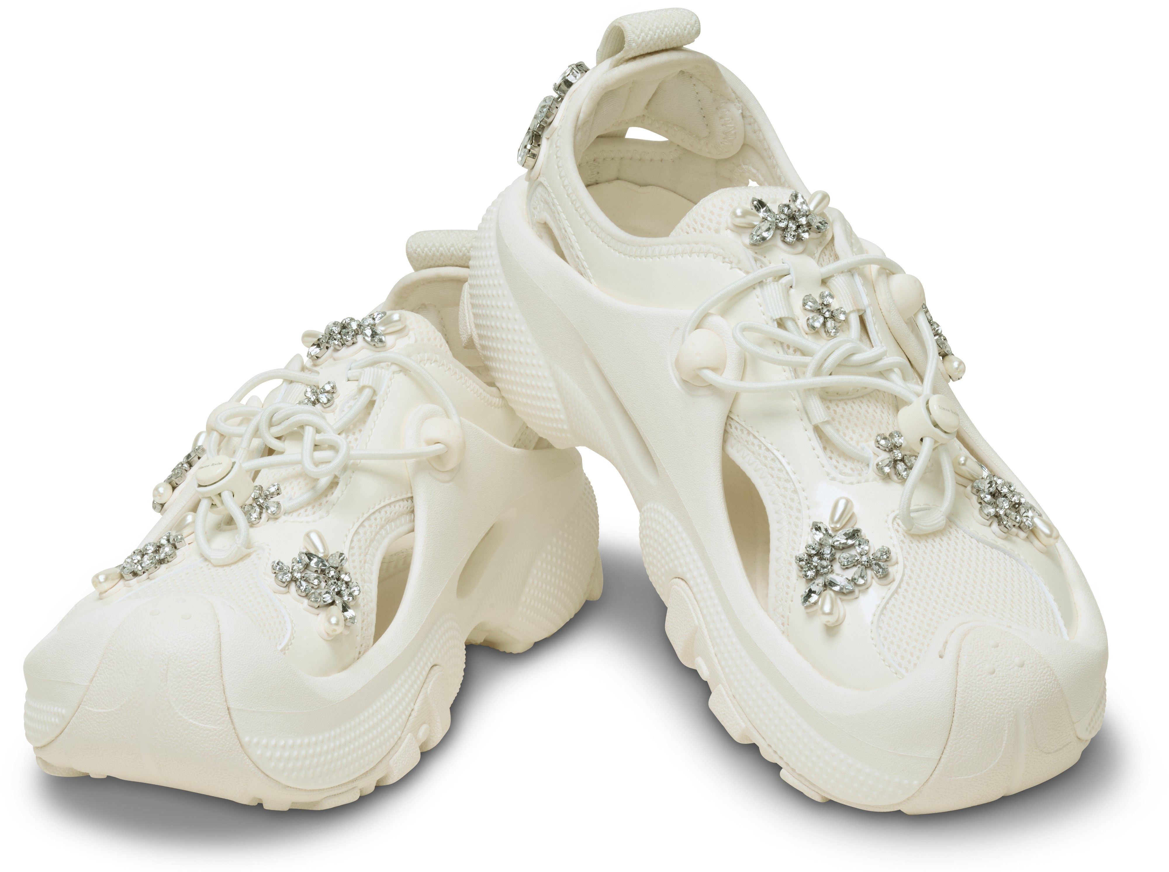 Simone Rocha x Crocs 路野鞋则成功打破了机能与优雅的界限。设计在Crocs经典户外基因的基础上,结合开放式网眼鞋面兼顾透气机能与轻盈质感。该鞋款推出暗黑色与牡蛎白两种配色,鞋面点缀的立体水钻花卉,其设计巧妙平衡了温柔与不羁活力,于对比中彰显出大胆而前卫的格调。