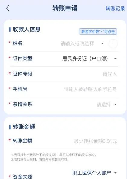 A:点击“医保钱包”页面上的“转账申请”,填写收款人信息,提交即可。转账成功后,转账人和收款人都可以在自己的医保钱包界面查询钱包余额及转账记录。