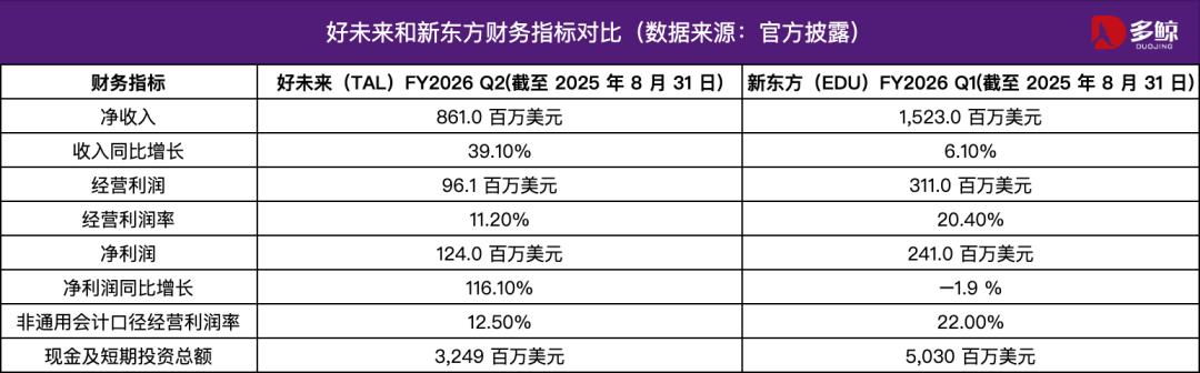 截至 2025 年 8 月 31 日,好未来的 2026 财年第二季度收入 8.61 亿美元,同比增长 39.1%;新东方的 2026 财年第一季度收入 15.23 亿美元,同比增长 6.1%。