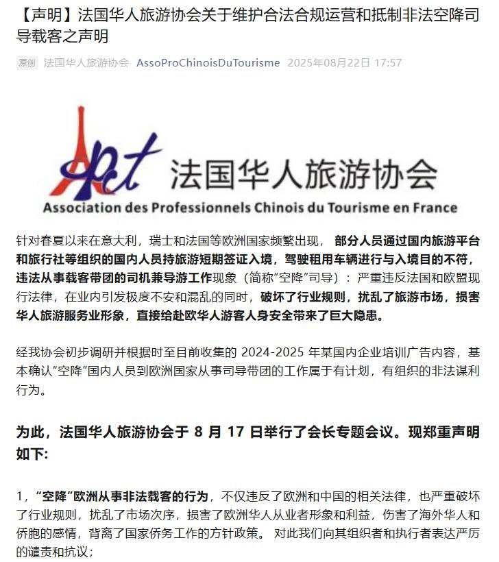 B总一顿输出下来,让我想起前段时间法国华人旅游协会发布的一则公开声明,矛头直接指向从国内空降、持旅游签证的“黑车司导”。