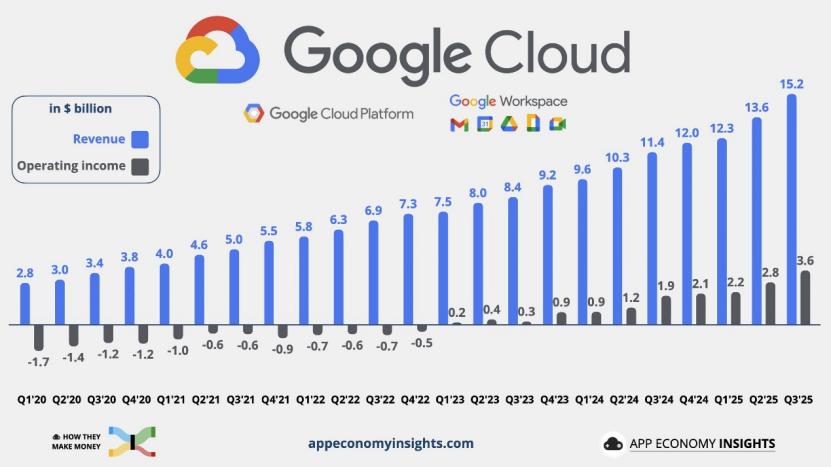 图注:谷歌云2020年-2025年三季度的营收与盈利贡献趋势图