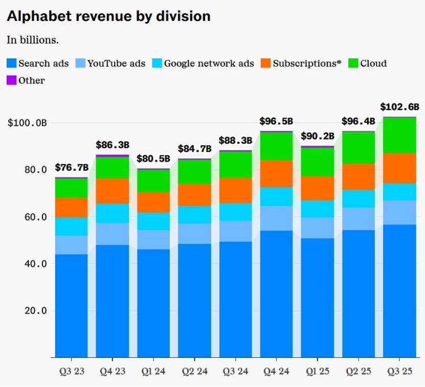 图注:谷歌2023年三季度-2025年三季度分部门营收