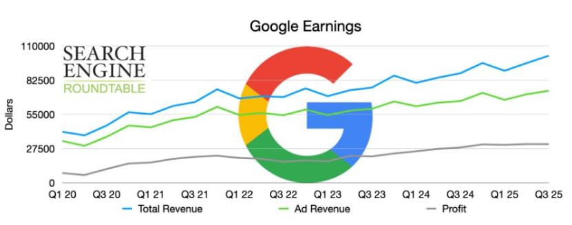 图注:谷歌搜索2020-2025三季度的广告收入与总收入走势对比