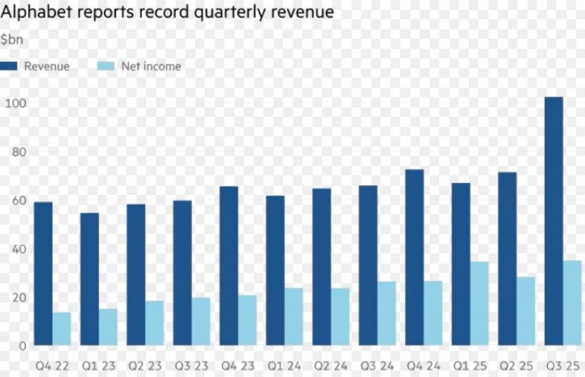 借着AI的东风,Alphabet公司2025年三季度营收1023.5亿美元,是公司史上季度营收首次超越千亿美元。高于此前分析师预期的998.9亿美元,同比增长16%。