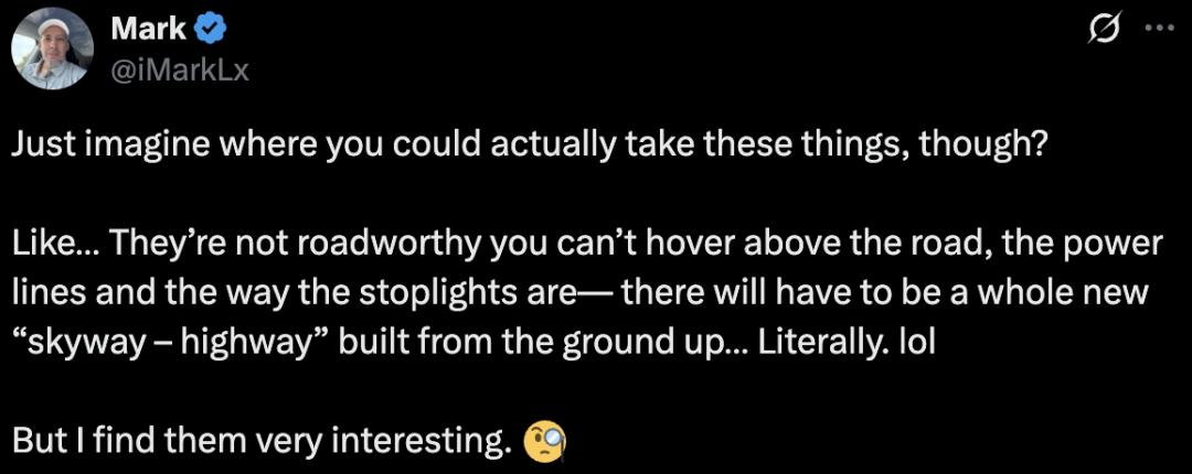 有网友评论称,它们根本不适合上路,你不可能悬停在路面上,因为有电线和交通信号灯,这就必须从头开始建造一条全新的「空中高速公路」。