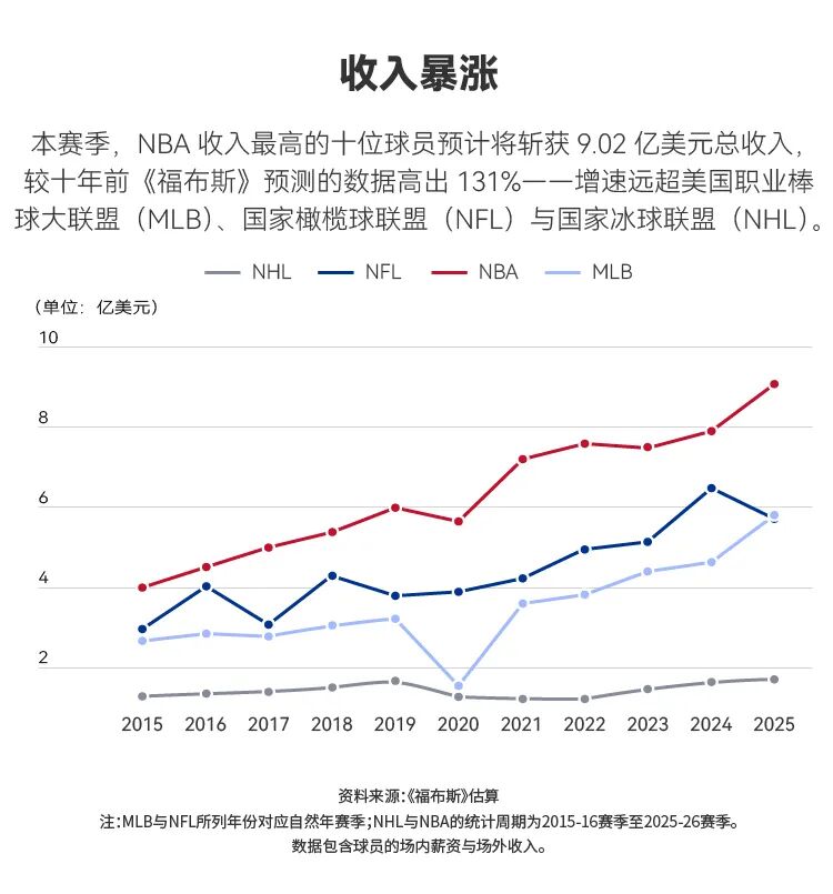 不过,库里并非唯一实现收入突破的NBA球星。本赛季收入前十球员的税前且未扣除经纪人佣金的总收入达9.02亿美元,较去年创纪录的7.87亿美元增长15%。