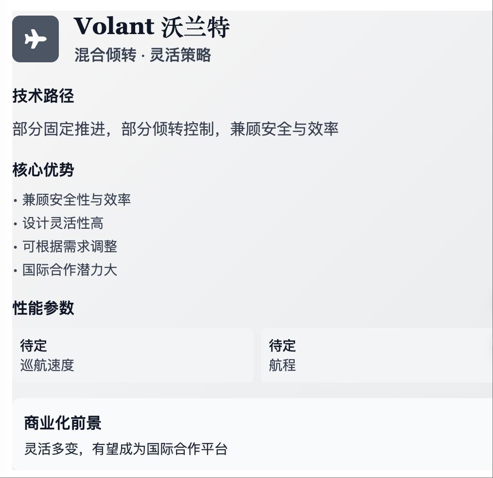 沃兰特的动作更轻盈,采用混合倾转方案,既能垂直起降,也可巡航数百公里,布局更像 Joby 与 Archer 的折中体。