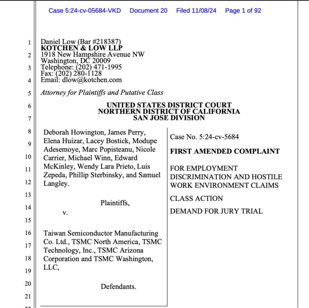 台积电在美国面临日益扩大的集体诉讼风波,原本由一名在加州任职人资部门的女性员工于2024年11月发起,至2025年7月已扩大至17人参与,诉状长达160多页,指控内容涵盖种族歧视、职场边缘化、报复打压及工作环境安全疑虑。原告指出,近30名原告的集体诉状中控诉道,“不是来自东亚、中国台湾和中国大陆的员工,经常受到中国台湾管理层的斥责和辱骂,甚至当着同事的面。他们被骂‘懒惰’、‘愚蠢’,仅仅因为他们是美国人。”(是的,台积电在美国被控诉歧视本地人。)