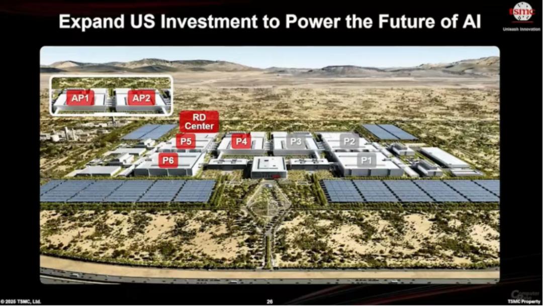 2025年10月,台积电宣布即将收购其在美国最新晶圆厂附近的另一处大型地产,可能在目前1650亿美元的投资规模之上进一步加码。台积电表示:“计划将使台积电能够扩展到亚利桑那州的独立超级晶圆厂集群,以支持来自智能手机、人工智能和高性能计算应用领域领先客户的需求。”