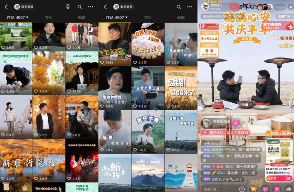 10月15日至今,董宇辉还是按照自己的节奏开展活动,先后在新疆、陕西杨凌、广西、辽宁盘锦进行直播,推广当地产品。