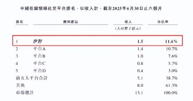 “红娘”模式的创新下,“伊对”付费用户快速增长,招股书数据显示,伊对2025年上半年的营收约15亿元,在线情感社交平台市占率第一。