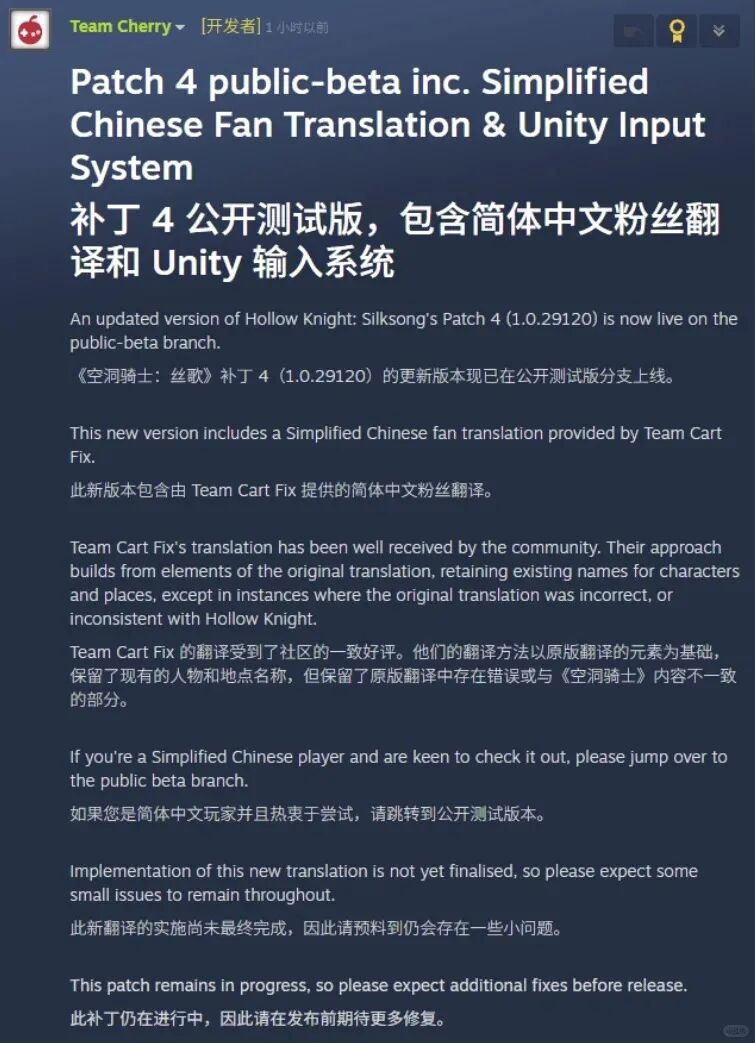 10月28日,《空洞骑士:丝之歌》补丁4(版本1.0.29120)的更新现已在公开测试分支发布,其中中文翻译部分正式引入了由中国玩家团队 Team Cart Fix 制作的简体中文民间翻译内容。