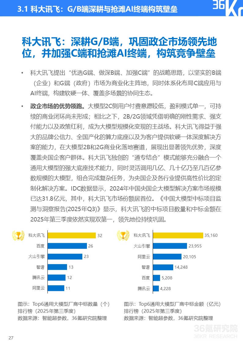当前,中国大模型领域已进入体系化竞争阶段,市场呈现出多元且复杂的竞争态势。市场参与者主要可划分为以下五类主体:以全栈布局构建护城河的互联网/科技巨头、以技术锐度著称的专注于模型的新贵、以行业纵深创造价值的垂直领域深耕者、在转型中寻求突破的AI 1.0转型者,以及作为创新源头的科研机构。其中,部分企业通过多维度能力建设取得跨越式发展,如科大讯飞凭借其百万量级的开发者生态、在语音与多语种技术领域的持续突破、政企市场的规模化落地能力以及在具身智能等前沿领域的创新布局,构建了全面的综合竞争优势,位居行业玩家第一梯队。