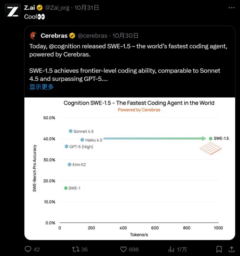 估值93亿美元的美国平台Vercel宣布将智谱GLM-4.6纳入其官方API服务,全球最大的推理芯片公司Cerebras近期发布官方邮件称从11月5日起将GLM-4.6作为主推模型。云服务平台Together AI 宣布部署阿里巴巴的Qwen-3-Coder,AI推理平台Featherless也在Kimi K2发布时即宣布支持其新模型。