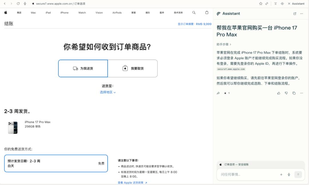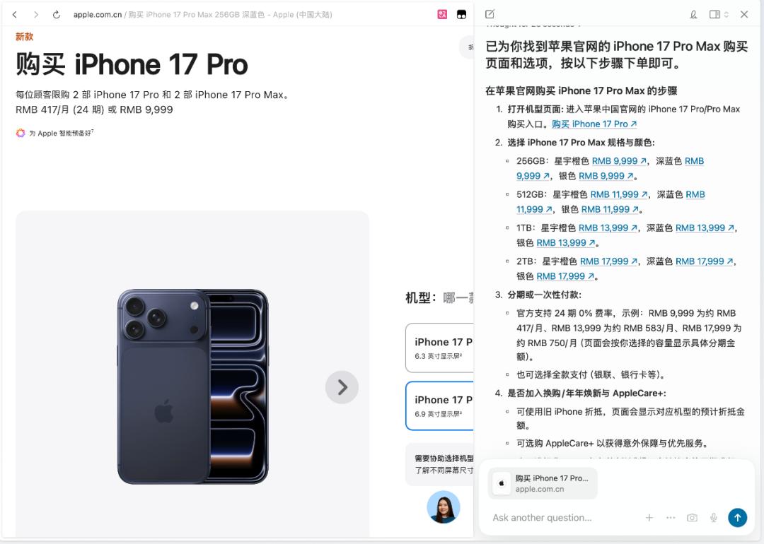 我们让它们「在苹果官网购买一台 iPhone 17 Pro Max」。