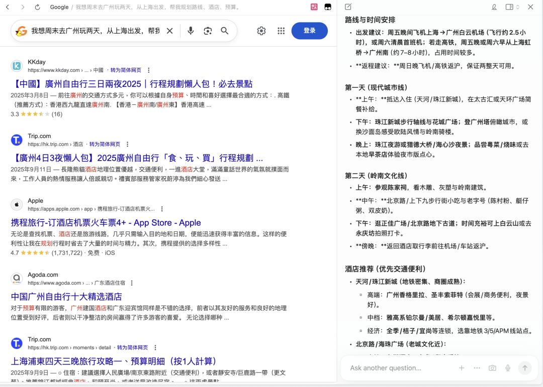 我们试了个需求:「我想周末从上海去广州玩两天,帮我安排路线、酒店和预算。」