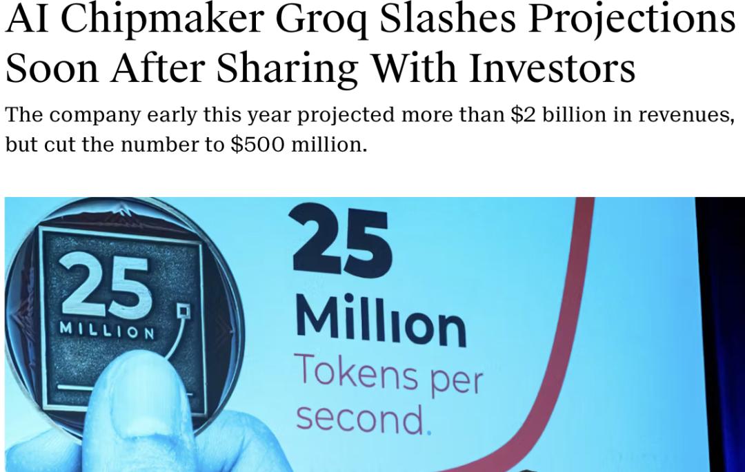 另一家芯片公司Groq也遭遇类似困境,原本预计2025年收入为20亿美元,如今已将预测下调至5亿美元。