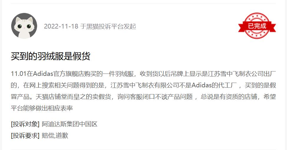 值得注意的是,这已不是阿迪达斯第一次被曝光羽绒服代工。黑猫投诉平台显示,早在2022年11月,便有消费投诉买到了阿迪达斯羽绒服是雪中飞代工。