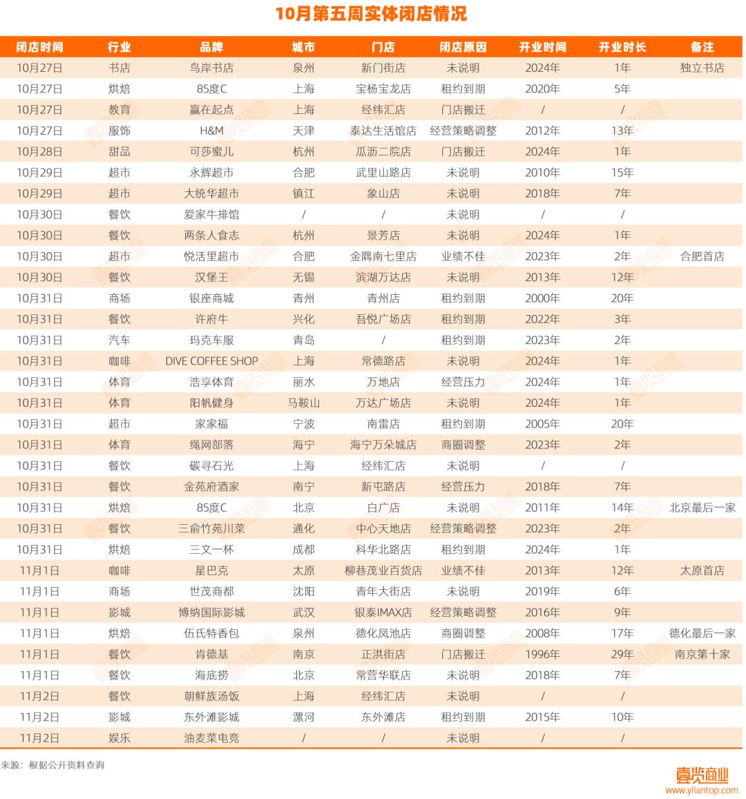 据壹览商业不完全统计,10月第五周,共32个品牌关闭了至少33家门店。