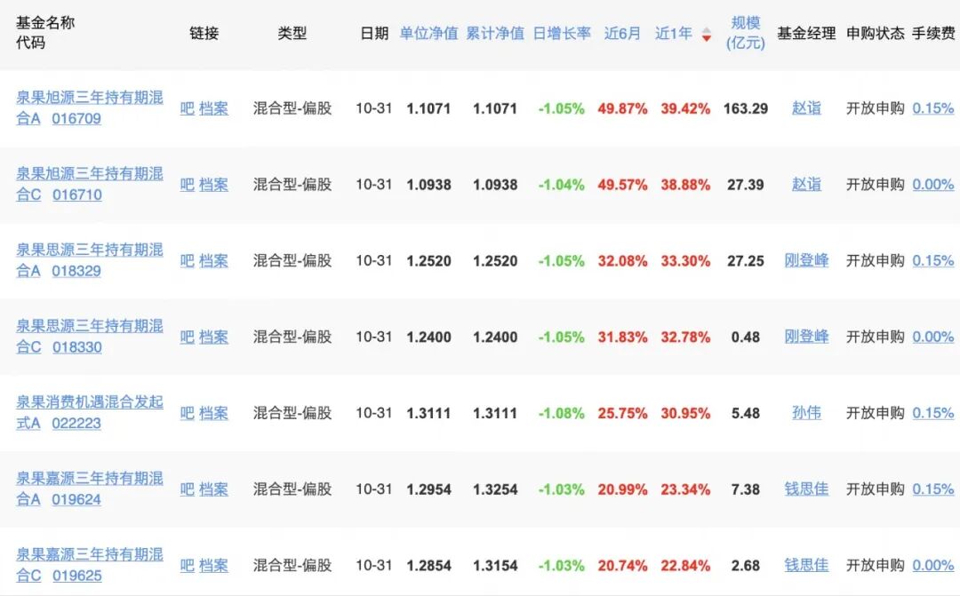 据天天基金网数据,截至今年9月末,泉果基金的管理规模为237.25亿元,基金数量10只,基金经理有5名。从基金产品来看,多数为混合型偏股基金,其中有7只基金近1年的净值增长超过30%。