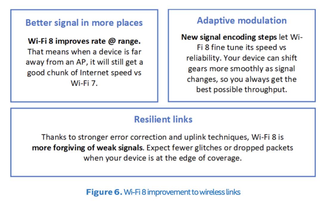 所有这些改进意味着 Wi-Fi 8 在远距离传输方面速度更快、更可靠。在多房间环境中,与 Wi-Fi 7 相比,在相同远距离位置,Wi-Fi 8 的速度应该更高。例如,如果 Wi-Fi 7 在楼上卧室的速度为 50 Mbps,那么 Wi-Fi 8 在同一位置的速度可能达到 65-70 Mbps(提升 25% 或更多)。这也意味着您的连接不会像以前那样突然骤降或掉线——它的降级过程更加平缓,从而保持了良好的可用性。这对于大型住宅和办公室,甚至是墙壁较多或干扰较多的普通住宅来说都是个好消息。图 6 总结了 Wi-Fi 8 为无线连接带来的主要改进。