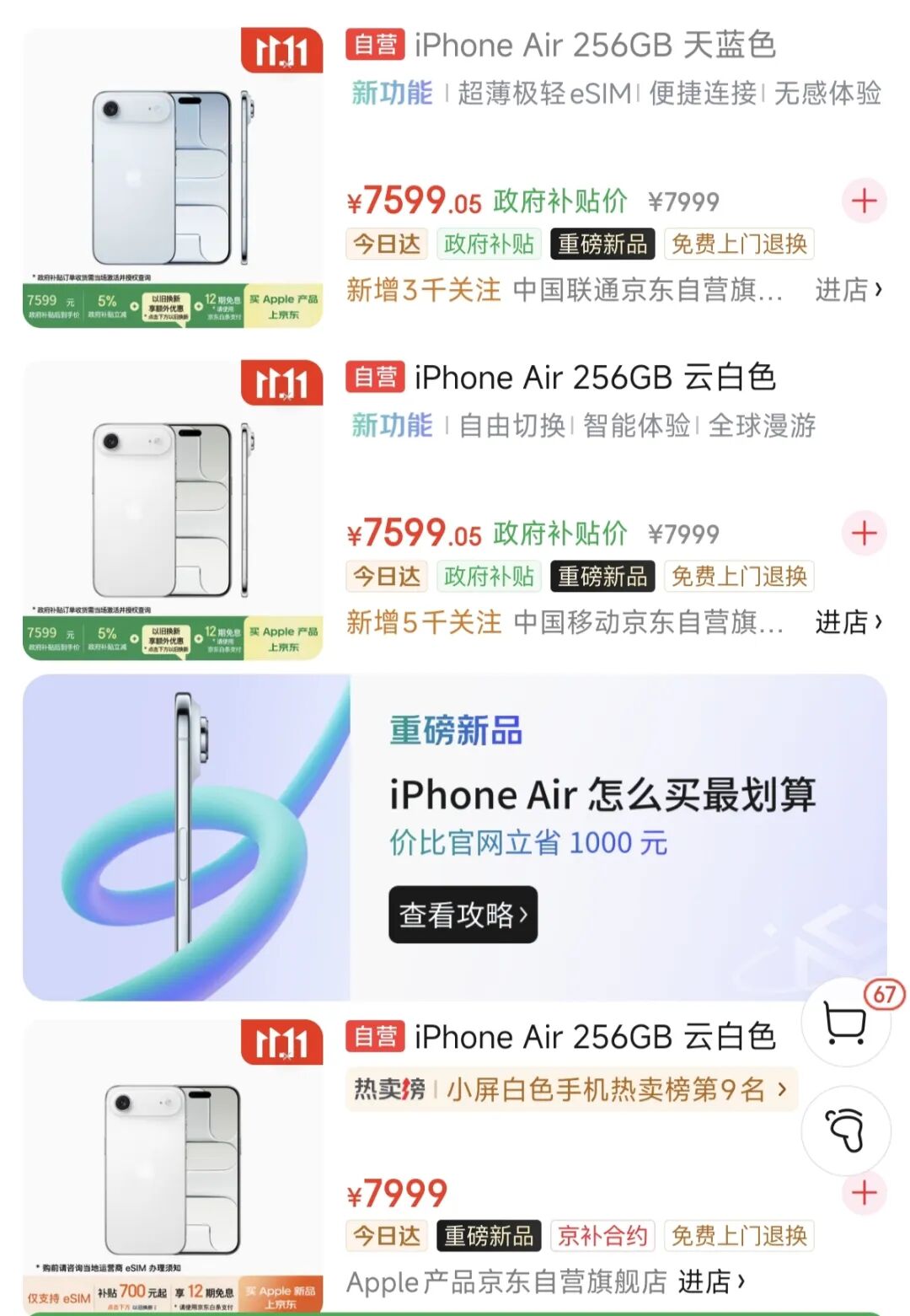 近日,京东APP显示,刚于10月22日正式发售的iPhone Air已加入“政府补贴”,包括256GB/512GB/1TB机型。