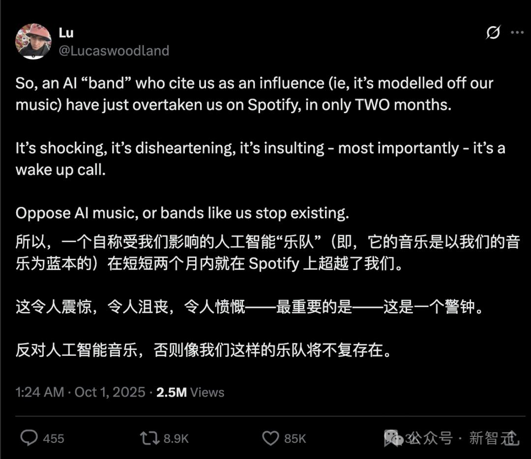 他呼吁人们抵制AI音乐,否则像他们这样的乐队将不复存在。