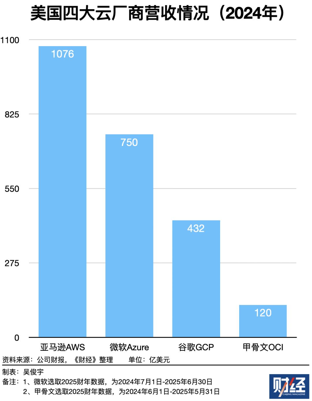 财报显示,亚马逊2024年营收1076亿美元,微软Azure 750亿美元(2025财年营收,即2024年7月1日-2025年6月30日,包括微软Azure,还包括服务器操作系统许可证、数字化咨询服务等传统业务),谷歌GCP 432亿美元,甲骨文OCI 120亿美元(2025财年营收,即2024年6月1日-2025年5月31日)。