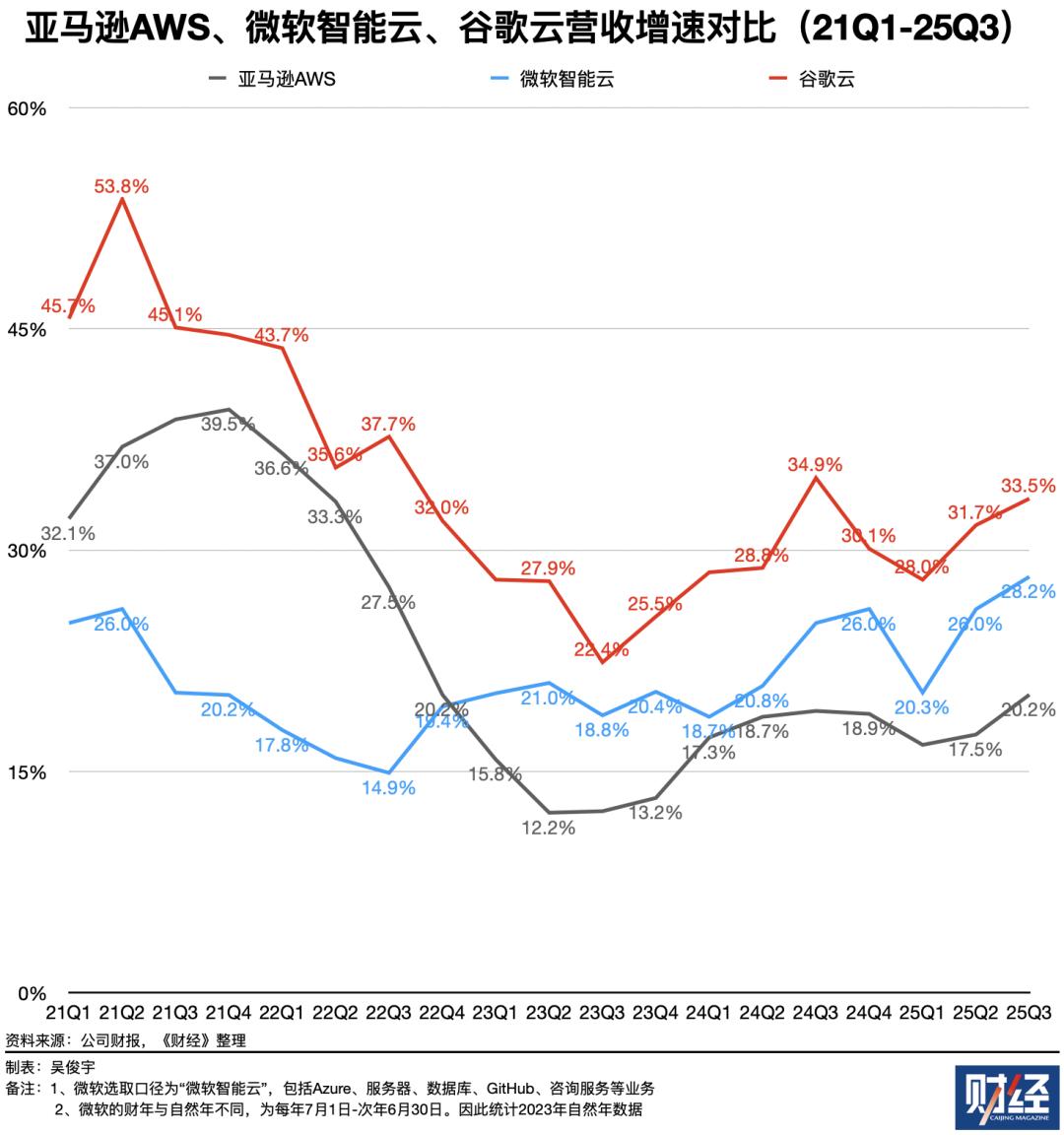 这也意味着,未来几个季度,亚马逊AWS的业绩将因此受益。财报显示,2024年亚马逊AWS营收1076亿美元,同比增长18.5%。2025年,随着生成式AI浪潮落地加速,亚马逊AWS的营收增长还在加快。2025年三季度,亚马逊AWS营收330亿美元,同比增长20.2%。这一增速是三年来(2022年四季度至今)的最高点。