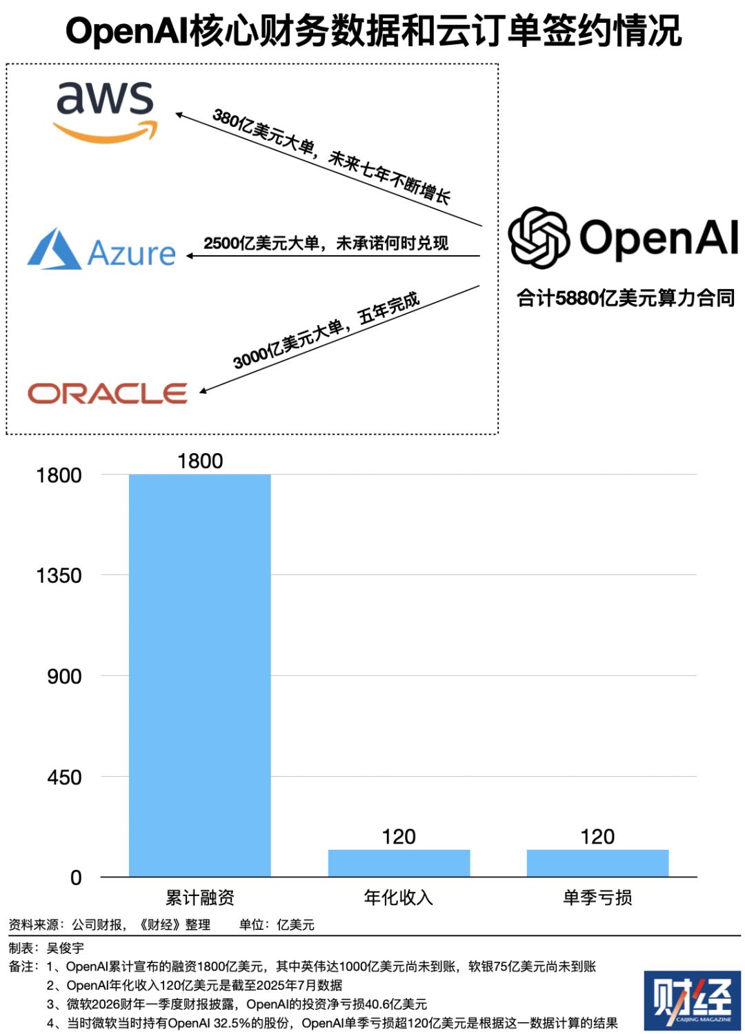 近两个月,OpenAI和微软、甲骨文、亚马逊共签署了5880亿美元算力大单(甲骨文5年3000亿美元、微软2500亿美元、亚马逊7年380亿美元)。多位行业人士对《财经》表示,OpenAI能否兑现并落地近6000亿美元的大单,是摆在面前的第一个问题。