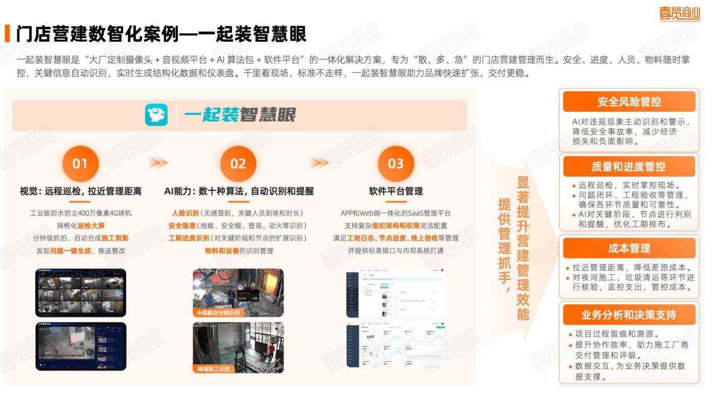 以“一起装智慧眼”为例,这一系统是集“大厂定制摄像头+音视频平台+AI算法包+软件平台”于一体的门店营建数智化解决方案,已在多家连锁茶饮品牌的扩店工程中落地应用。其核心在于通过“视觉层—AI层—软件平台层”的三层架构,打通门店建设全流程的信息链。