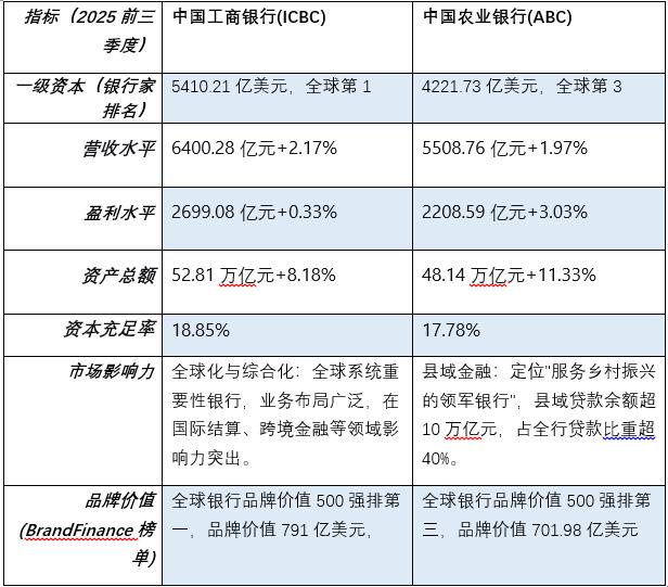盈利水平:尽管农行在2025年上半年四大行中“唯一的双正增长”,但工行在营收、利润、资产总额上都比农行高。