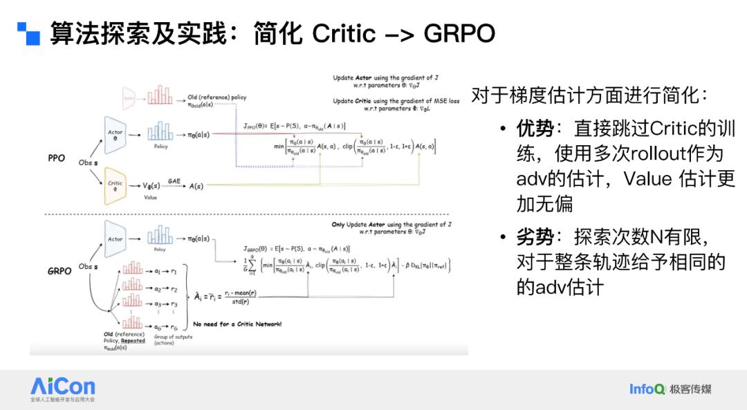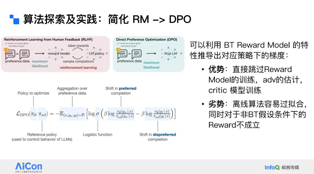 在后续的实践中,我们的算法探索和实践逐渐走向了两条不同的道路。首先,我们看到了 PPO 算法虽然相对复杂,但在去年早期,强化学习刚兴起不久,由于整个系统的复杂度较高,我们考虑基于我们的 BT 奖励模型,如果信号来源仅限于偏好对,那么我们可以将 PPO 算法的损失函数设计成另一种形式。这种形式避免了奖励模型的训练和 Critic 函数的使用。在某些业务场景中,这种探索的效果相对较好。它的优势在于,我们可以跳过奖励模型的训练和优势估计,也不需要使用 Critic 模型进行训练和推理,能够便捷地在一些特定细分的业务场景中优化偏好对的好坏。然而,它的劣势也很明显。首先,它的假设非常强,即我们的奖励模型必须符合 BT 假设,即一对好坏的假设。但在强化学习过程中,这种假设有时过于严格,因为有些领域并不需要通过比较相对的好坏,例如数学领域本身就存在绝对值。此外,对于 BT 奖励模型而言,它本身并非强假设,只要奖励信号准确,就可以引入。同时,这是一种离线算法,不涉及在训练过程中动态更新模型并推理出新样本进行训练,因此有时容易过拟合。这种算法,如 DPO 算法,大家可能听说过很多,但随着强化学习框架的成熟和算力的进一步提升,以及大家对强化学习技术理解的加深,它逐渐退出了历史舞台。