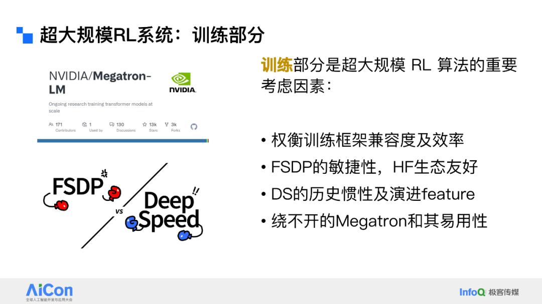 训练部分看似最为常规,但其中也存在诸多挑战。在超大规模训练中,我们需要考虑的最重要因素是什么?其实,我们需要在框架的兼容性和效率之间做出权衡。如果大家是行业从业者,那么在进行预训练和 SFT 时,基本都会在不同框架之间做出选择,要么是功能强大的 Megatron,要么是像 DeepSpeed 这样较为轻量级的、基于 Hugging Face 体系的框架。但选择并非随意,因为像 Megatron 这样高效的框架,其维护成本较高,同时在兼容性方面也必然会牺牲一些与 Hugging Face 生态系统的互动性。而 FSDP 和 DeepSpeed,大家都知道在强化学习领域,现在很多人都倾向于使用 FSDP,包括 FSDP2 这种类似于 ZeRO-3 的方式。然而,这其中存在很多历史惯性问题,比如 DeepSpeed 中的 ZeRO-3 和 FSDP 到底该如何选择等,这些问题都是我们在训练过程中需要仔细考虑的重要因素。
