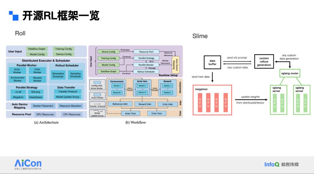 阿里巴巴也推出了一个名为 Roll 的框架,由淘天集团主导开发。它的主要特点是针对 Agentic 方式进行了设计,借鉴了强化学习中 RL Gym 的模式,帮助用户快速搭建 Agentic 的工作流程,有兴趣的用户可以尝试使用。最后是 Slime,它的理念是用最简单的方式去做最大规模的事情,通过将 SGLang 与 Megatron 结合,以生成为中心进行开发。