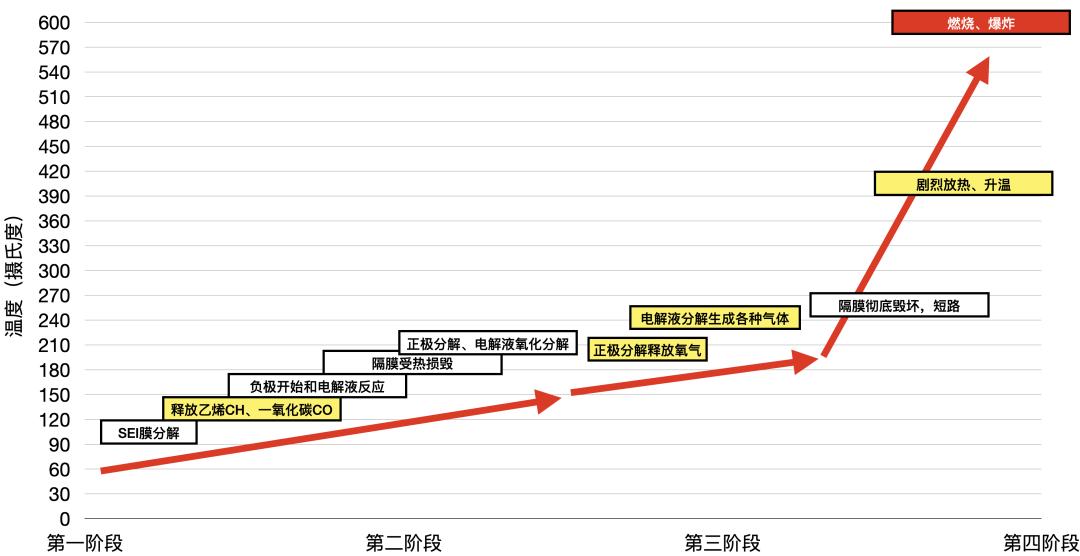 一旦电池进入热失控,电池内部就会引发各种连锁反应,甚至都不用很热,只要100多度就已经足够启动“毁灭之旅”了——110度左右,石墨负极就会开始和电解液反应,150度左右,隔膜就会融化,进而导致短路,温度急剧升高——电解质里的有机溶剂受热会分解出氢气、一氧化碳、甲烷、烃之类的易燃易爆气体,正极材料则会在高温下分解释放出大量的氧,只要温度再高一点点,就会导致剧烈的燃烧乃至爆炸。