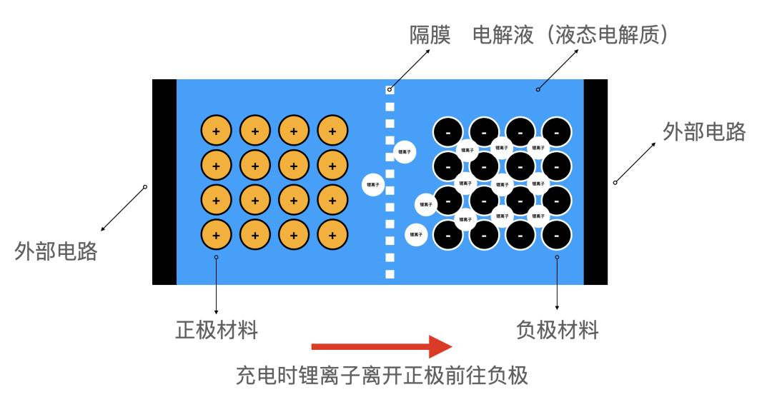 充电的时候,外界的电压驱使正极上的锂离子离开,经过电解质的传递,穿越隔膜,最终嵌入负极材料上。与此同时,电子也经由外部线路,从负极来到正极处。