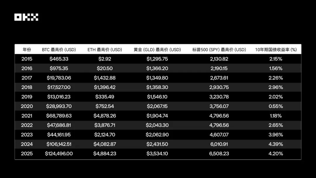 就此,OKX研究院以「10年五大主流资产表现」为核心,试图回答一个关键问题:在长达10年的时间尺度上,将BTC和ETH与黄金、标普500指数、美国国债等主流资产并置,它们各自的收益与风险的真实画像究竟如何?我们是否为加密资产的惊人回报付出了对等的、甚至超额的风险代价?为此,我们将超越单一收益率的对比,力求绘制一幅完整、客观、穿越周期的资产表现图谱。(统计数据截止2025年8月31日)