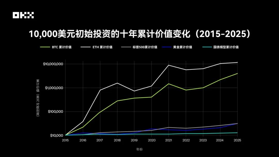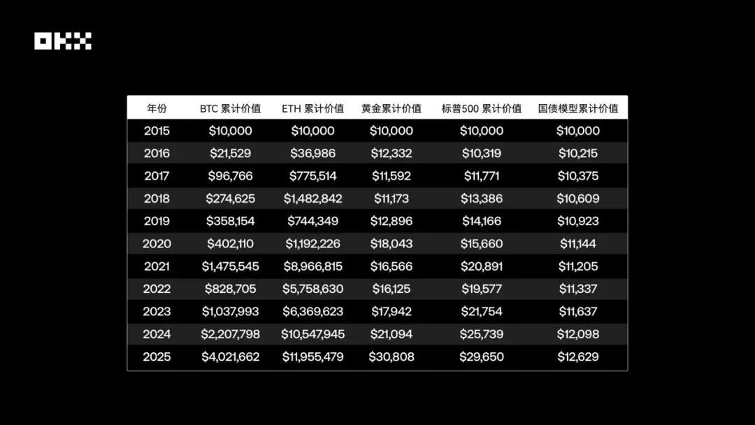 表格显示,在 2015—2025 十年间,不同资产的增长倍数分别为:BTC 402.17 倍,10年累计收益约为 402 万美元、ETH 1195.55 倍,10年累计收益约高达 1,195 万美元、黄金 3.08 倍,10年累计收益约3 万美元、标普500 2.97 倍,10年累计收益约约 2.96 万美元、美国国债 1.26 倍,10年累计收益仅约1.26 万美元。