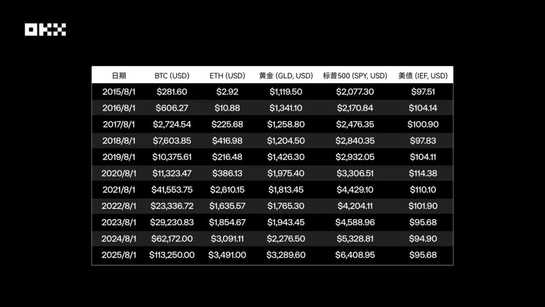 下表记录了从2015年至2025年,在每年的8月1日(或其后的首个交易日)五种核心资产的收盘价格。